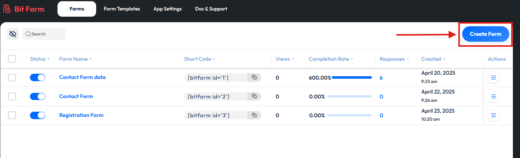 Nach der Aktivierung erstellen Sie Ihr auf Ihr Unternehmen zugeschnittenes Kontaktformular, indem Sie auf "Formular erstellen", oder Sie können auch eine der vorgefertigte Vorlagen. Da Bit Form ein Drag-and-Drop-Builder ist, können Sie Felder einfach per Drag-and-Drop ziehen und Ihr WordPress-Formular nach Ihren Wünschen anpassen.