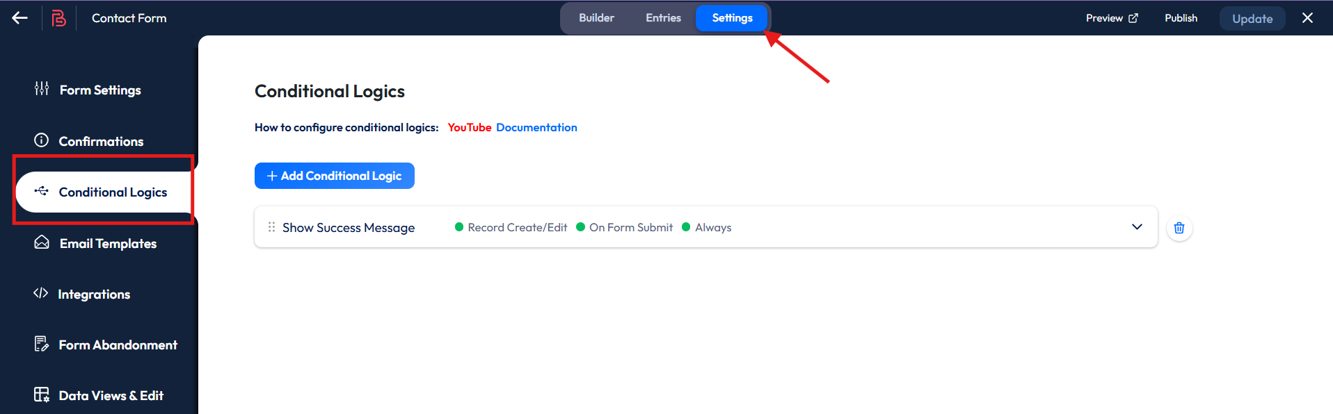 Nachdem Sie nun ein Formular erstellt haben, gehen Sie zum Abschnitt Einstellungen des Formulars und klicken Sie auf "Bedingte Logik" von der linken Seite.
