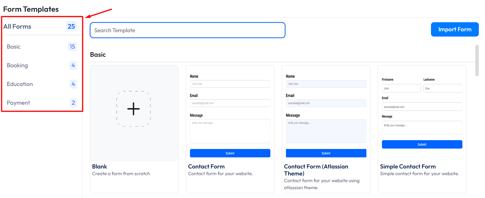 On the left side, you’ll see all the templates organized into categories. Just click on the type of form you need, then choose the template you want to use.
