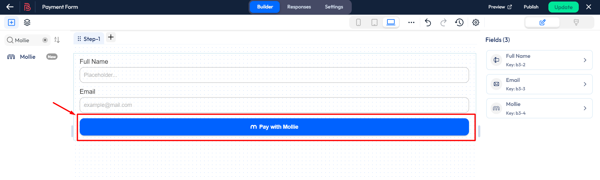 Go to Bit Form, open the form where you want to add Mollie. In the builder, search for Mollie and add it by clicking on Mollie or by dragging and dropping it into your form.