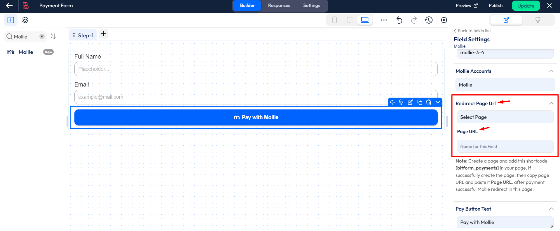 To redirect to the Mollie successful payments page, you can use the shortcode. Just copy the shortcode, create a new page, paste the shortcode into the page, and then publish it. After that, copy the page URL and paste it into the “Page URL” field in the Bit Form Builder.