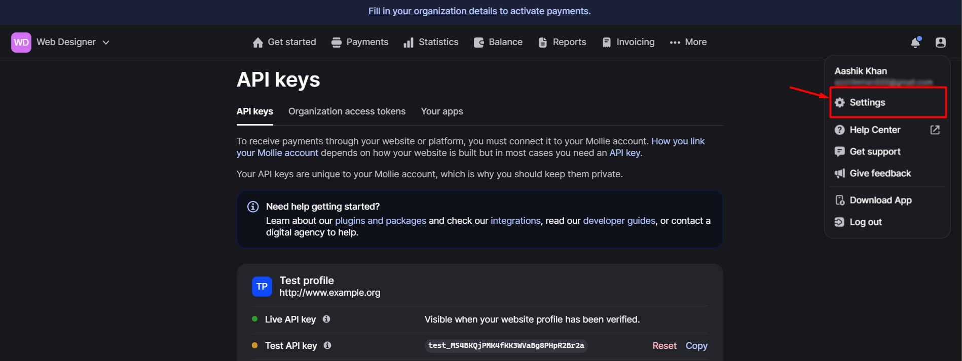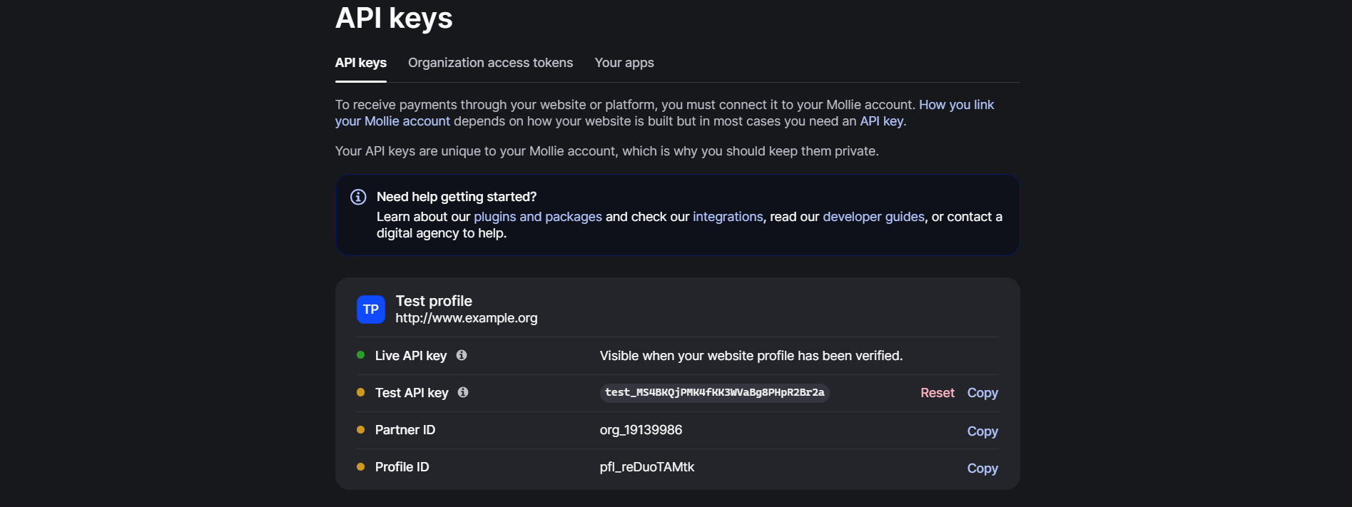 Just click on Mollie Developer Dashboard, and you’ll be redirected to your Mollie account where you can find your API key.