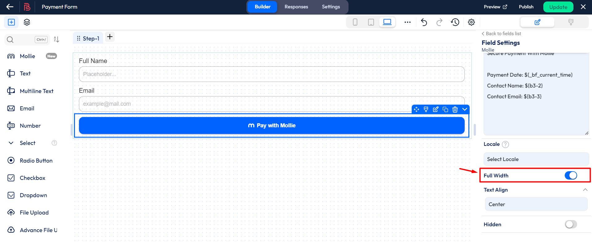 Admins can receive one-time payments and subscription payments through the Mollie field. Bit Form now allows you to use Mollie fields instead of the submit button. So, when admins use Mollie, they can remove the default submit button from the form. When a user clicks on the Mollie button, the form first validates all the form inputs and then opens the payment window.