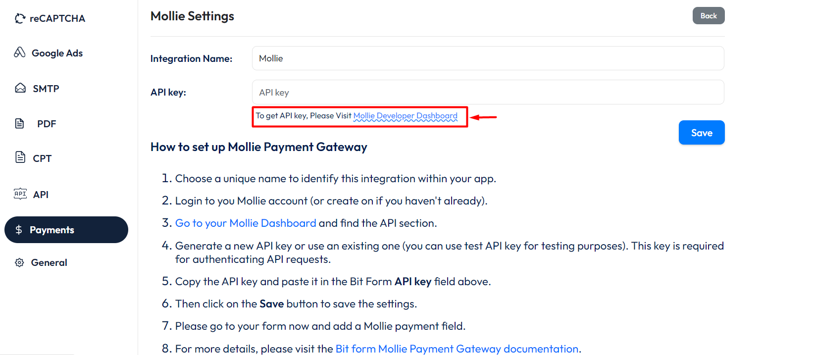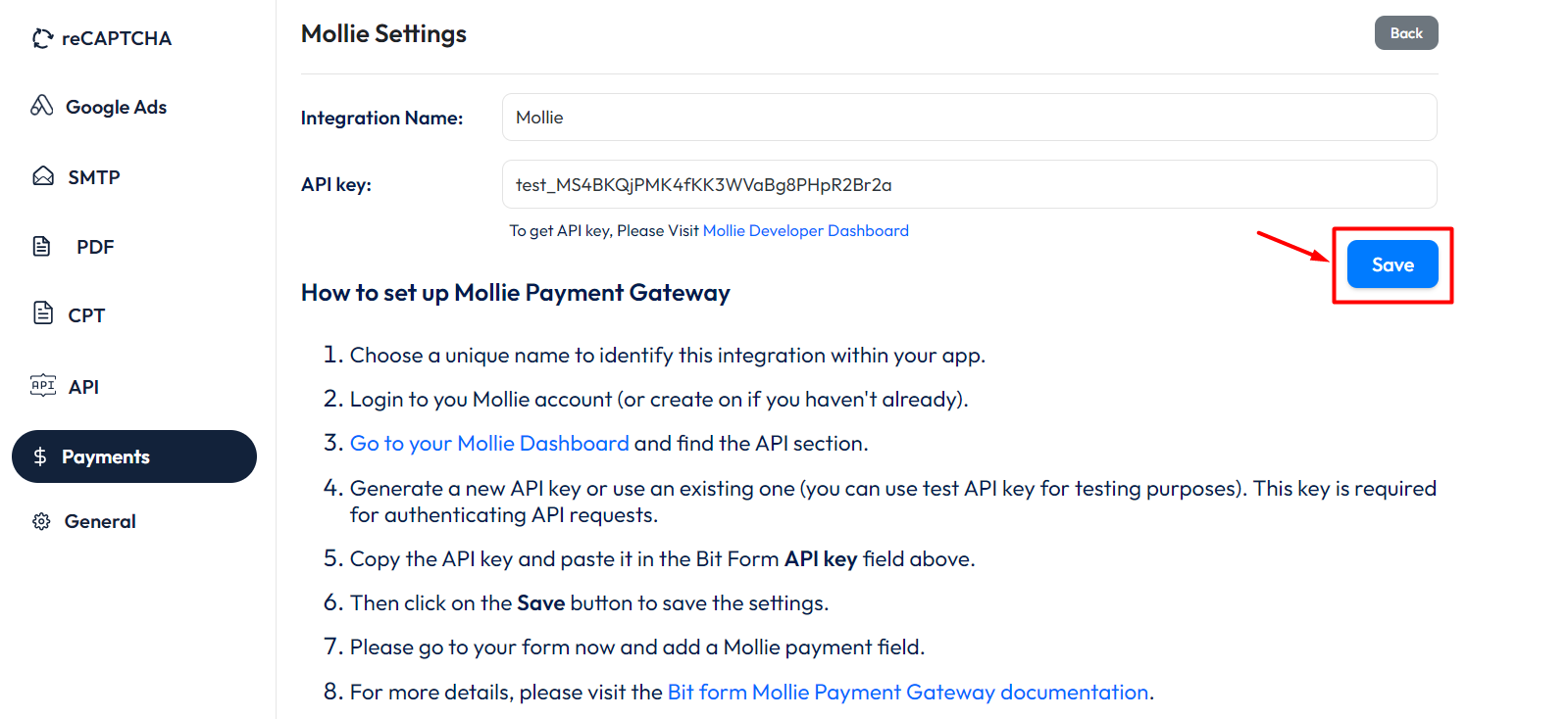 Copy the API Key, then return to Bit Form Payments and paste the API Key into the field for Mollie Integration.