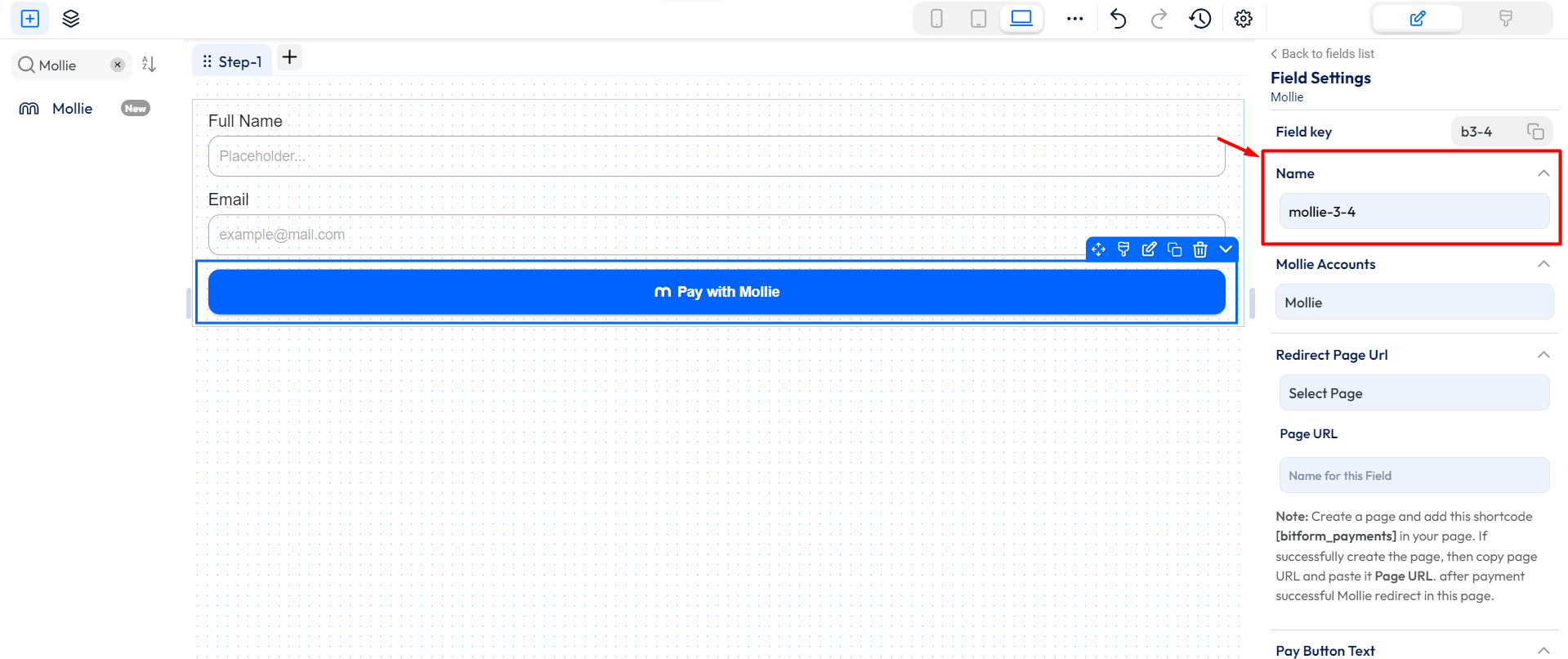 A field’s name is like a special label used when you submit a form. For example, let’s say the field name is “mollie-3-4”. In this case, ‘mollie’ tells us the type of field it is, ‘3’ refers to the form ID, and ‘4’ means it’s the fourth-number field on the form. This field name can be used for various purposes such as Fetch data from url parameter.